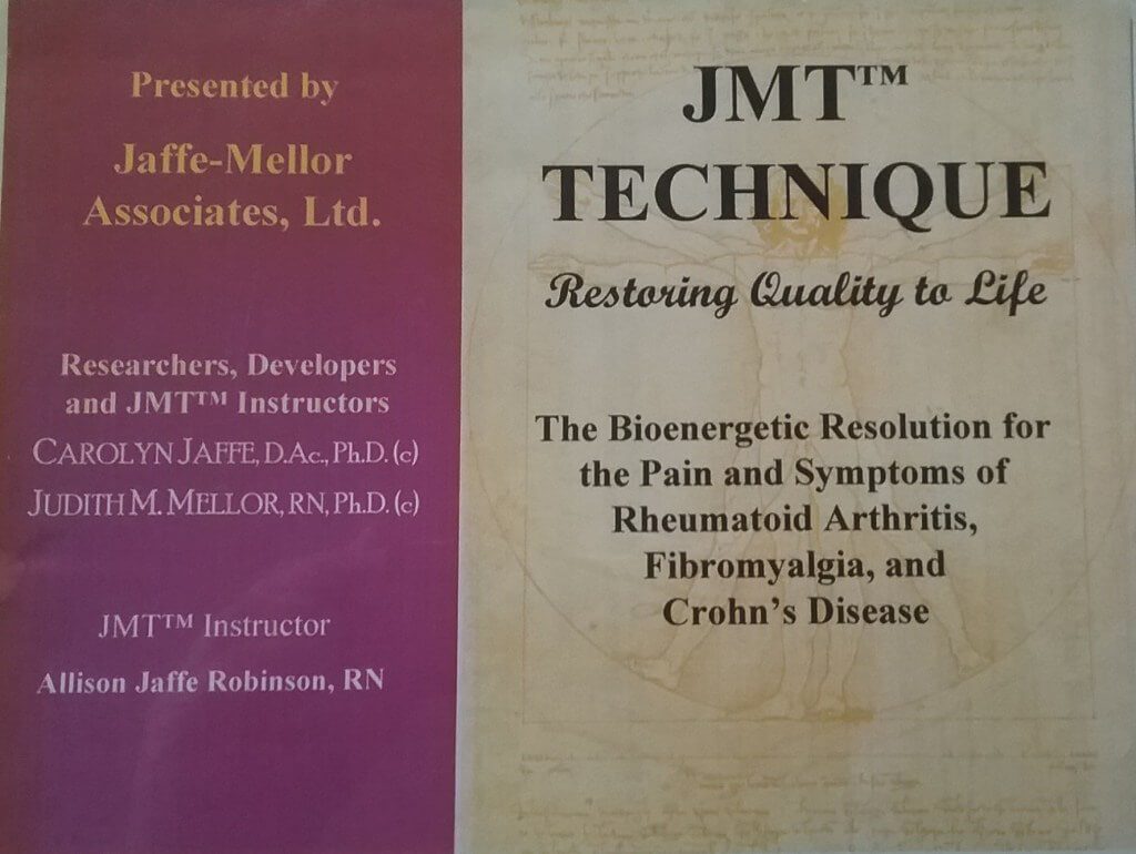 Jaffe-Mellor Technique™ (JMT™) is a revolutionary bioenergetic technique which has shown a significant reduction, and in some cases a total elimination, from the pain and symptoms associated with osteoarthritis and other degenerative bone disorders. JMT™ has been effective with rheumatoid arthritis, lupus, fibromyalgia, Lyme disease, Chrohn’s, myasthenia gravis, CFIDS, multiple sclerosis, muscular dystrophy and many other immune disorders. This technique involves reprogramming and repatterning of the body utilizing chiropractic theory and acupuncture/acupressure.